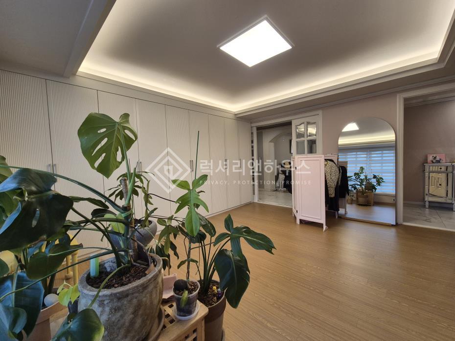 - 클래식한 천장 몰딩과 샹들리에가 어우러진 거실이 고급스러운 분위기를 완성합니다.